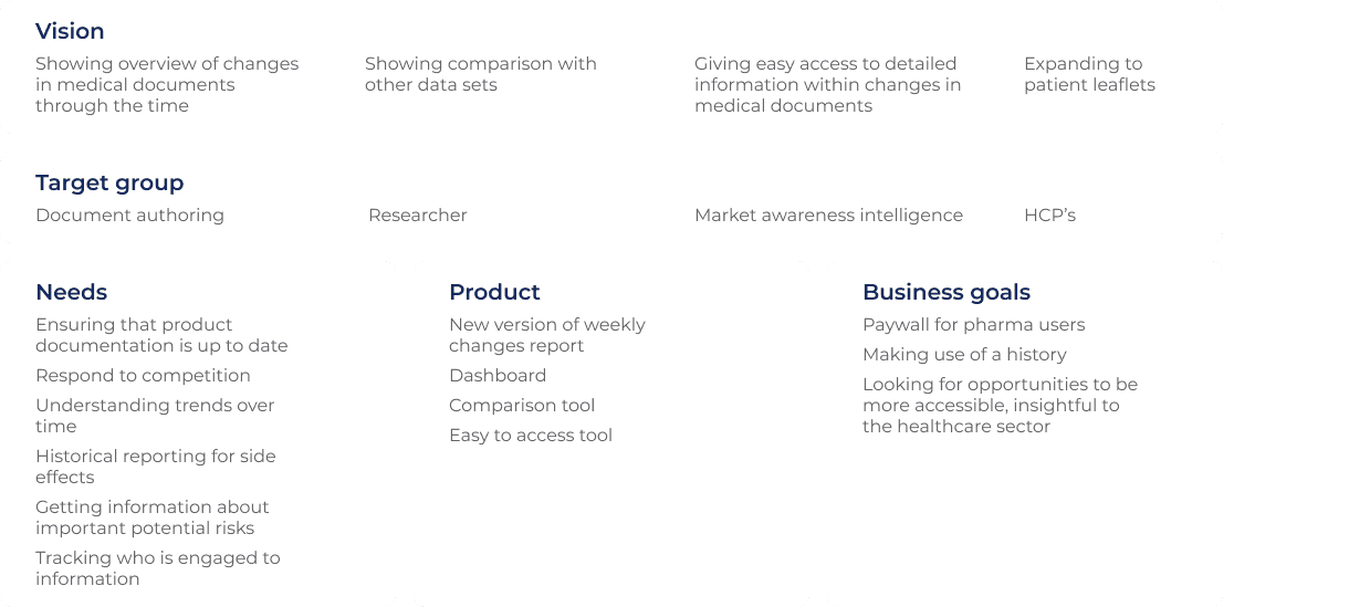 The core challenge wasn't UX — it was the domain. The most complex part of this project was understanding the legal and regulatory framework around drug documentation, and mapping how it connects to the technical possibilities of automatically pulling and analyzing leaflet data. Designing a clear way to present document changes required deep domain immersion before any wireframe could be drawn.