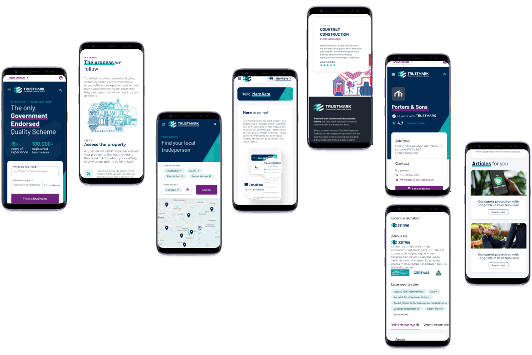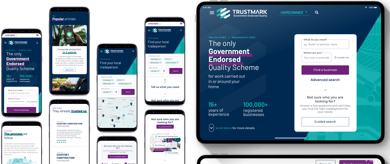 TrustMark is a UK government-endorsed platform connecting homeowners with certified contractors for energy-efficient home renovations. The platform needed a complete design to serve multiple user groups — individual homeowners, landlords, and businesses — in a domain heavy with legislation, compliance, and technical complexity.